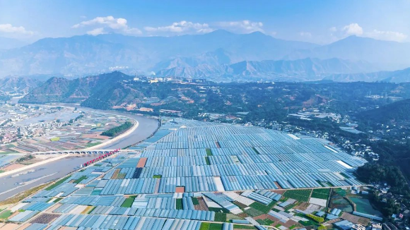 鳥瞰緊鄰米易縣城的萬畝蔬菜種植產(chǎn)區(qū)。這里位于安寧河畔,光熱資源豐富,適宜于作物生長。這里正在打造集觀光、文旅為一體的現(xiàn)代農(nóng)業(yè)產(chǎn)業(yè)體系。