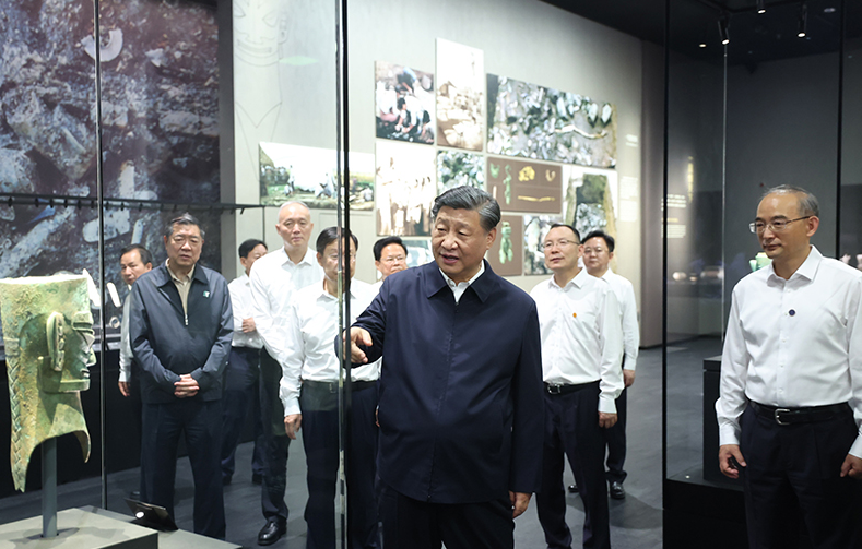 位于德陽市廣漢市西北鴨子河南岸的三星堆遺址,代表了數(shù)千年前的古蜀文明面貌和發(fā)展水平,是同時期長江流域文化內(nèi)涵最豐富、面積最大的都城遺址。26日下午,習(xí)近平來到三星堆博物館新館,參觀“世紀(jì)逐夢”、“巍然王都”、“天地人神”等展陳,了解三星堆遺址發(fā)掘歷程和古蜀文明成果。在三星堆博物館文物保護(hù)與修復(fù)館,習(xí)近平走進(jìn)文保修復(fù)工作區(qū),仔細(xì)察看文物保護(hù)修復(fù)工作流程細(xì)節(jié)和最新技術(shù),同現(xiàn)場工作人員親切交流。習(xí)近平指出,三星堆遺址考古成果在世界上是叫得響的,展現(xiàn)了四千多年前的文明成果,為中華文明多元一體、古蜀文明與中原文明相互影響等提供了更為有力的考古實(shí)證。文物保護(hù)修復(fù)是一項(xiàng)長期任務(wù),要加大國家支持力度,加強(qiáng)人才隊(duì)伍建設(shè),發(fā)揚(yáng)嚴(yán)謹(jǐn)細(xì)致的工匠精神,一件一件來,久久為功,做出更大成績。習(xí)近平代表黨中央,對三星堆博物館新館的落成使用表示熱烈祝賀,向廣大考古工作者表示衷心感謝和崇高敬意!