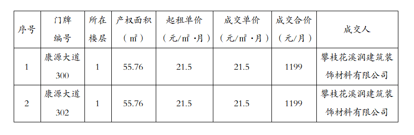 〔攀枝花市東區(qū)東華街道機(jī)場(chǎng)路149號(hào)(攀枝花萬(wàn)達(dá)廣場(chǎng)上行100米金泰悅城5樓)〕進(jìn)行了公開(kāi)競(jìng)價(jià),現(xiàn)對(duì)競(jìng)租結(jié)果進(jìn)行公示: